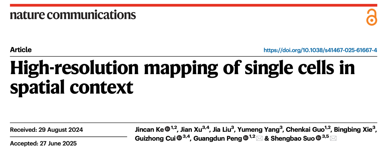 2025年7月15日,中國科學院廣州生物醫(yī)藥與健康研究院彭廣敦課題組和廣州國家實驗室索生寶課題組合作,在Nature Communications上發(fā)表了題為High-resolution mapping of single cells in spatial context的研究論文。