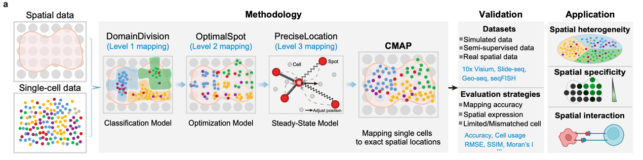 針對這一問題,研究團隊提出了CMAP(Cellular Mapping of Attributes with Position)計算模型,通過整合單細胞和空間轉錄組數(shù)據(jù),采用“分治”策略,實現(xiàn)大規(guī)模單細胞向空間位置的高精度映射。