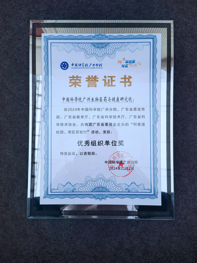 活動現場還頒發了“中國科學院科普進校園灣區百校行”優秀組織獎,廣州健康院榮獲此獎項。
