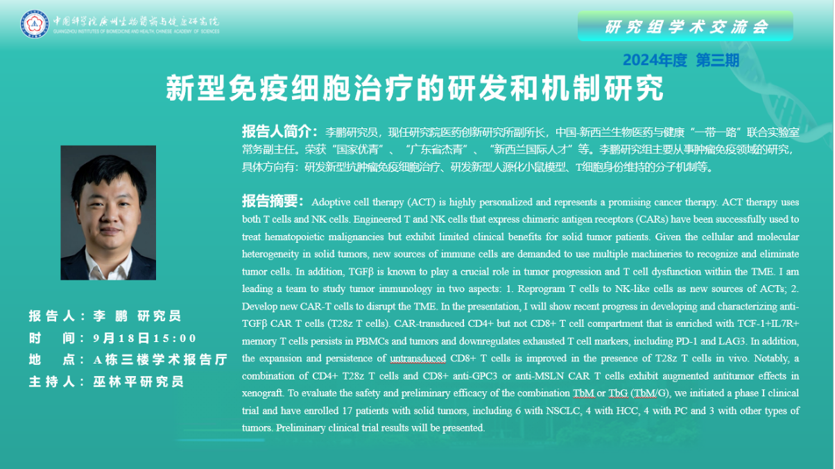 2024年9月18日研究組學術交流會(2024年第三期):新型免疫細胞治療的研發和機制研究