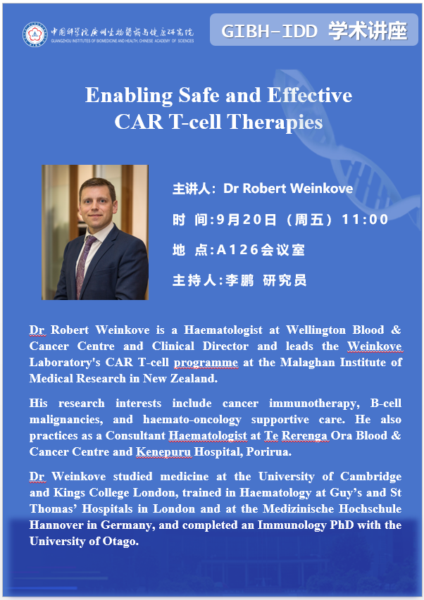 2024年9月20日院醫藥創新研究所(GIBH-IDD)學術講座:Enabling Safe and Effective CAR T-cell Therapies