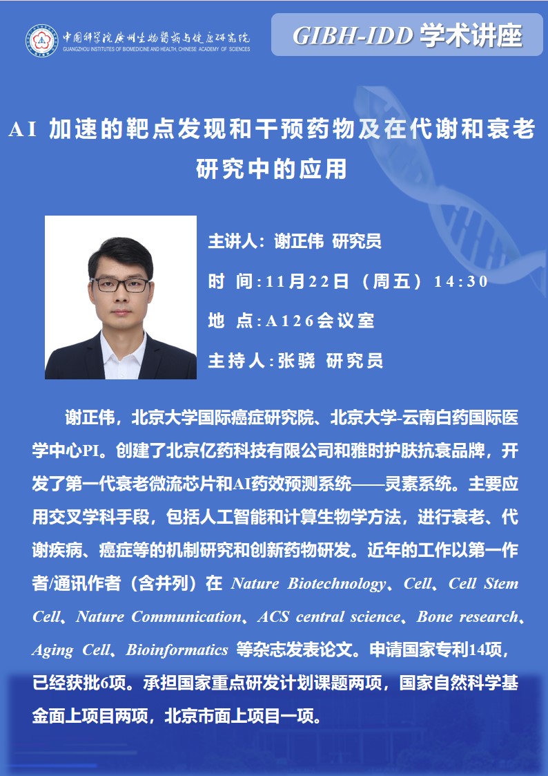 2024年11月22日GIBH-IDD學術講座:AI 加速的靶點發現和干預藥物及在代謝和衰老研究中的應用