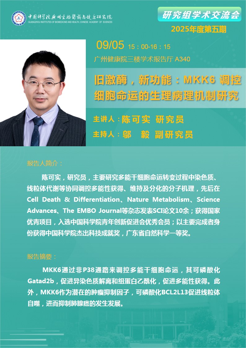 2025年5月9日研究組學術交流會(2025年度第五期):舊激酶,新功能:MKK6 調控細胞命運的生理病理機制研究
